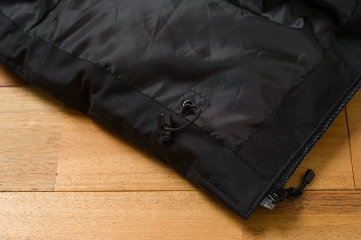 襟部分にコードが付いておりコードを引っ張るとフードが閉まり首周りからの風の侵入を防ぎます。