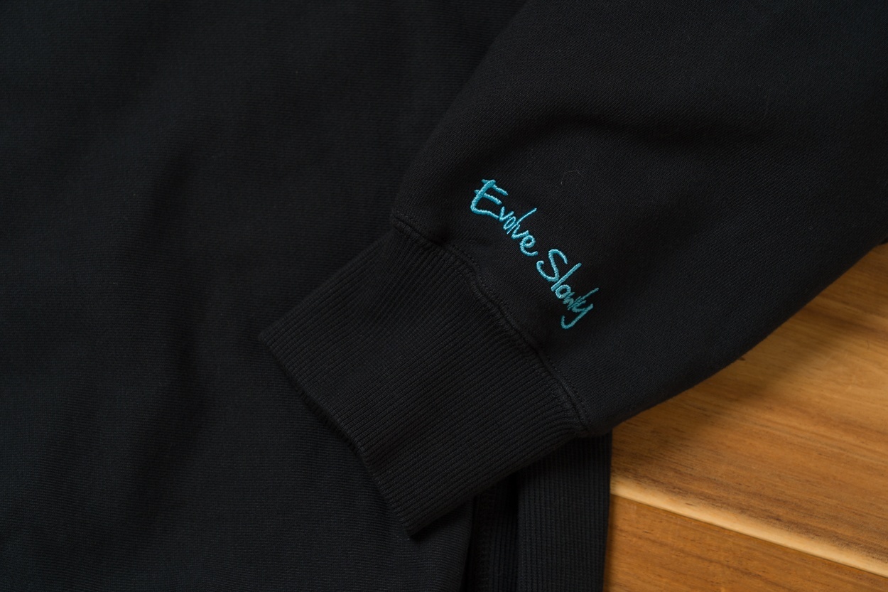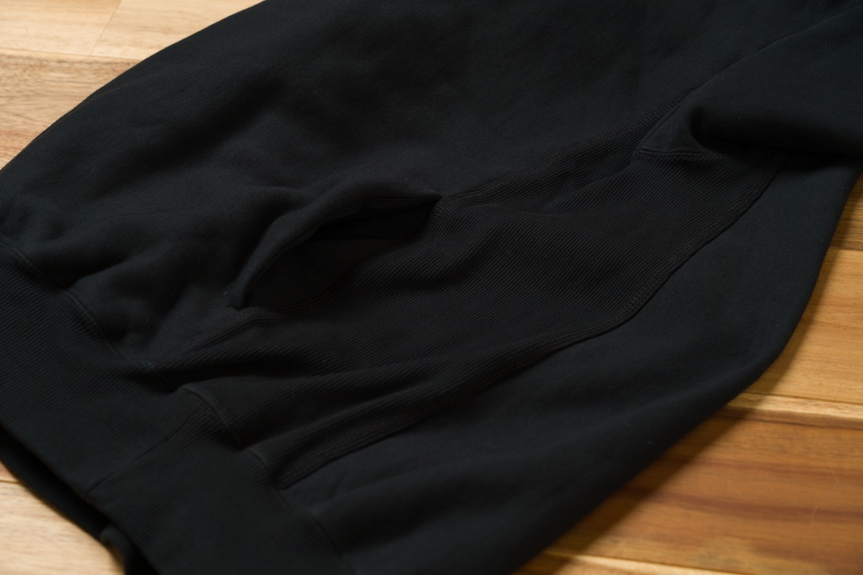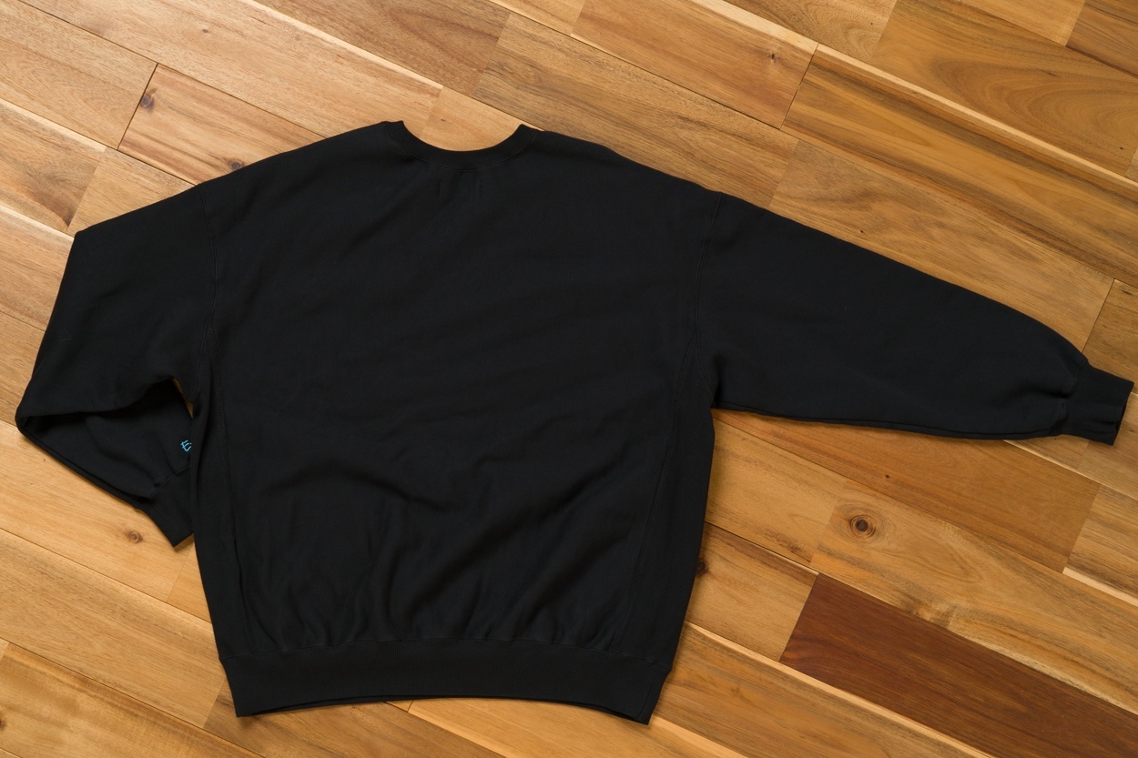 かなり長めに作った袖口のリブ。あえて、最大級のオーバーサイズシルエットで作っている分、自分で袖のリブ部分を折って調整できるよう、リブを一般的なトレーナーより長く作っています。